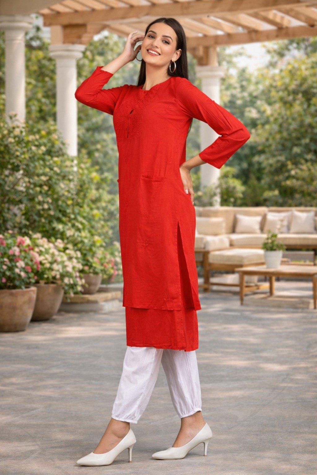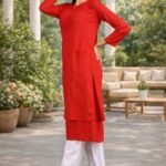 Elegant red straight-fit kurta with subtle embroidery detailing and 3/4th sleeves, paired with white pants. The side slit and simple neckline give it a classy and comfortable look. Perfect for casual outings, office wear, or small festive occasions.