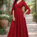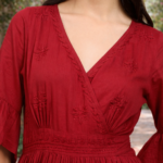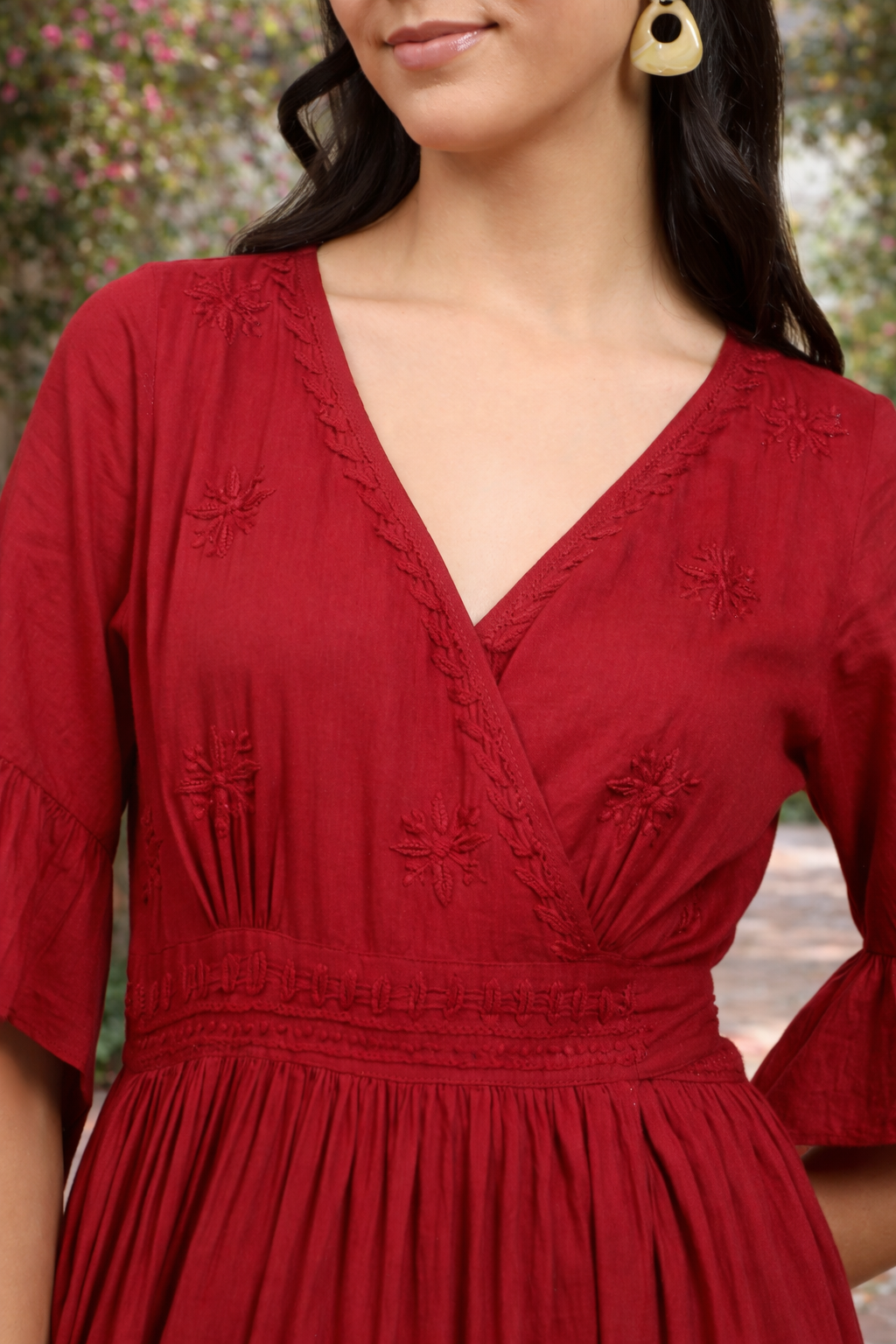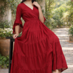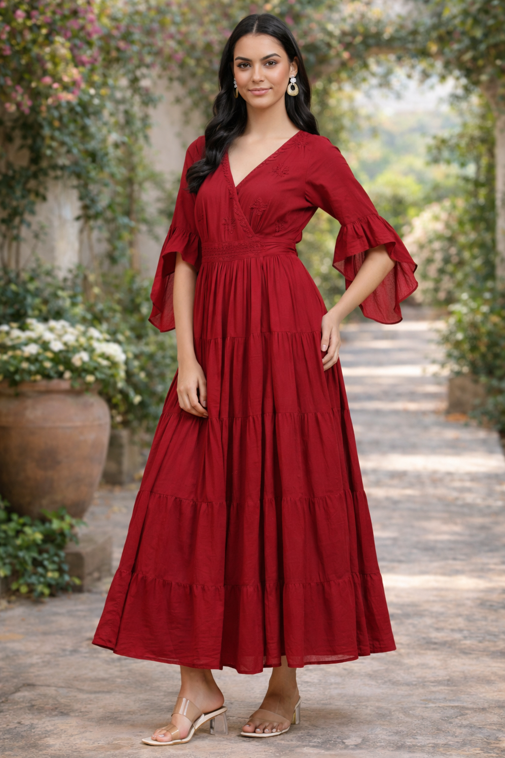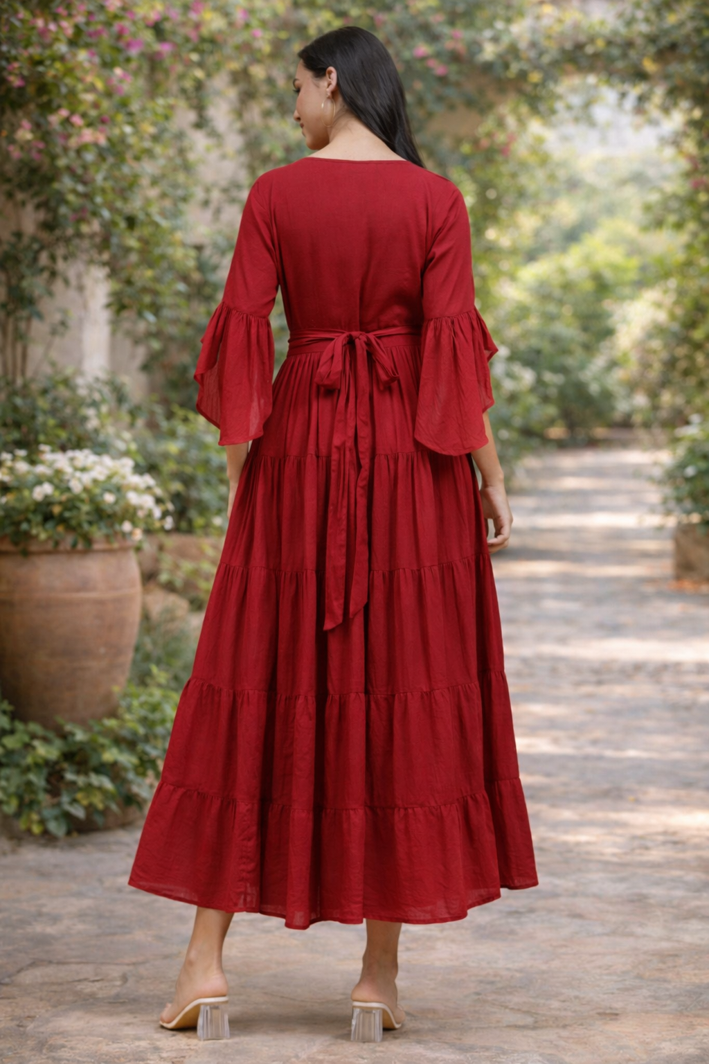 Step into effortless elegance with our Crimson Grace Tiered Dress, designed for the modern woman who loves comfort with style. Crafted in a soft, breathable fabric, this dress features a flattering wrap-style V-neckline and a beautifully gathered waist that enhances your natural silhouette. The flowy tiered design adds graceful movement, while the delicate sleeve detailing brings a touch of feminine charm. Perfect for brunches, casual outings, or festive moments, this timeless red piece is your go-to for understated sophistication. Key Features: Elegant wrap-style V-neck Flowy tiered silhouette for a flattering fit Soft, breathable fabric for all-day comfort Statement flared sleeves Rich crimson red color for a bold, graceful look Style Tip: Pair it with minimal heels and statement earrings for a chic daytime look, or dress it up with bold accessories for evening elegance