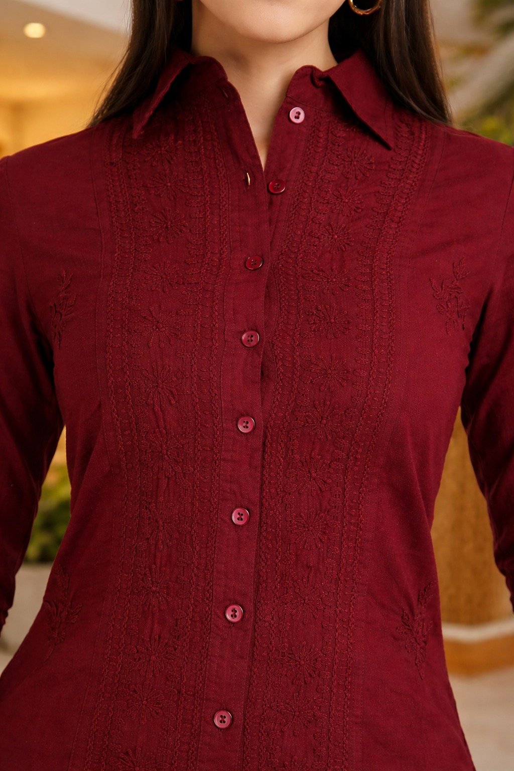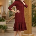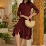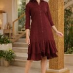 Add a touch of elegance to your wardrobe with this stunning maroon shirt-style dress. Designed with a flattering fit and stylish layered ruffle hem, this dress gives a classy yet modern look. The button-down front and 3/4th sleeves enhance its sophisticated appeal, making it perfect for brunch, casual outings, and evening gatherings. Premium soft fabric Elegant button-down design Stylish layered ruffle hem 3/4th sleeves Comfortable & flattering fit