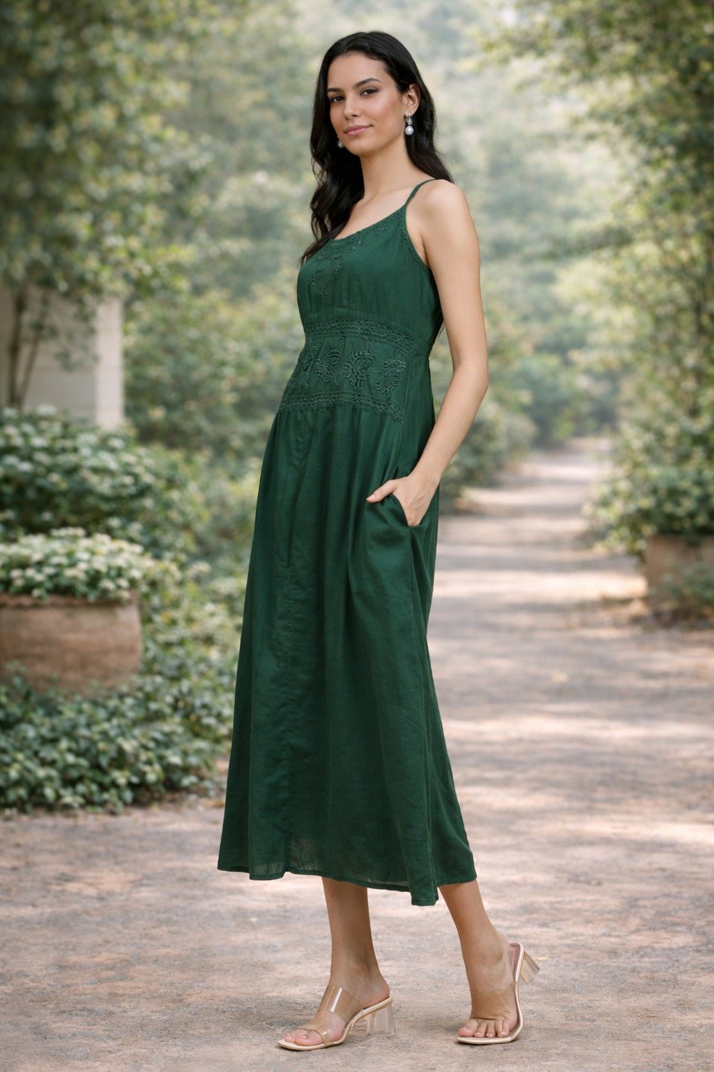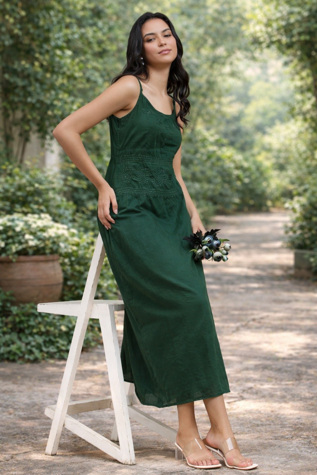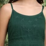 Upgrade your wardrobe with this elegant dark green maxi dress designed for comfort and style. Crafted from soft and breathable fabric, this dress features beautiful embroidered detailing on the bodice that adds a touch of sophistication.