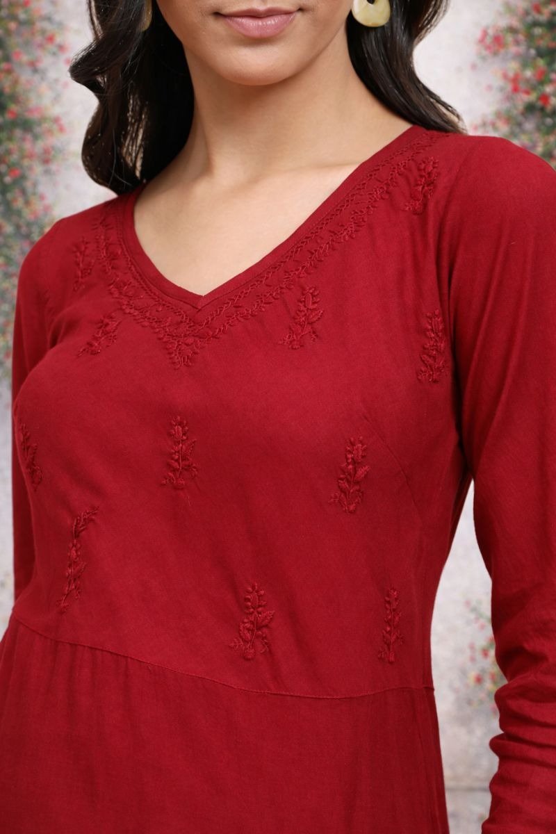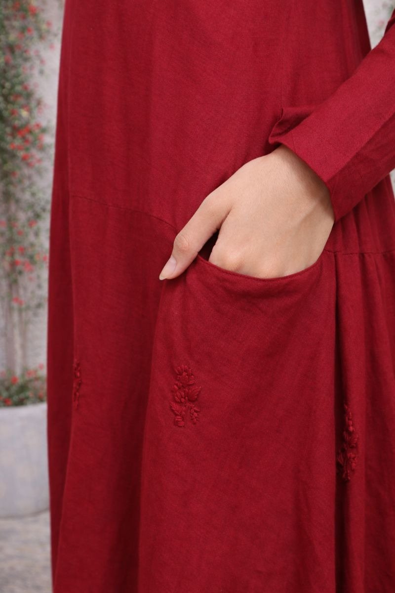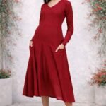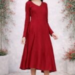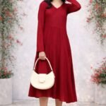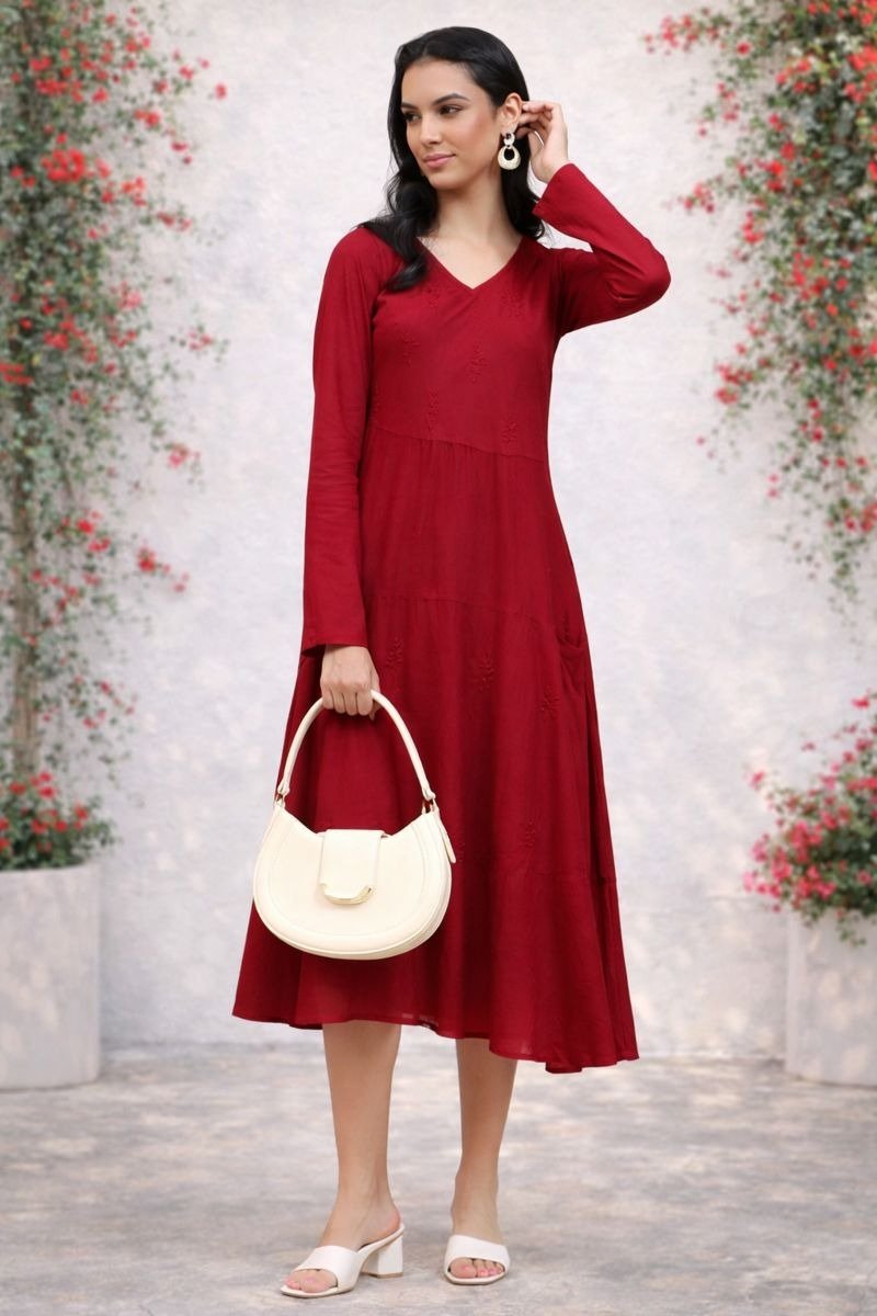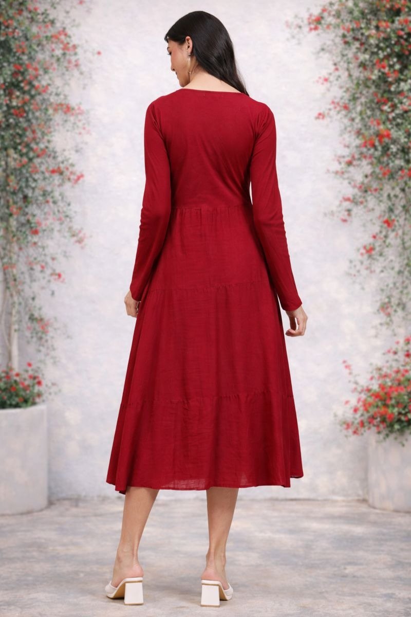 Add elegance and charm to your wardrobe with this beautiful red midi dress. Designed with a flattering V-neck and full sleeves, this dress offers both style and comfort.