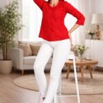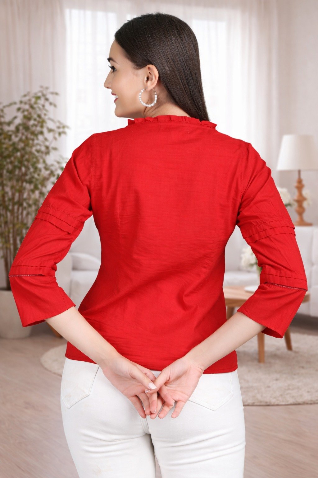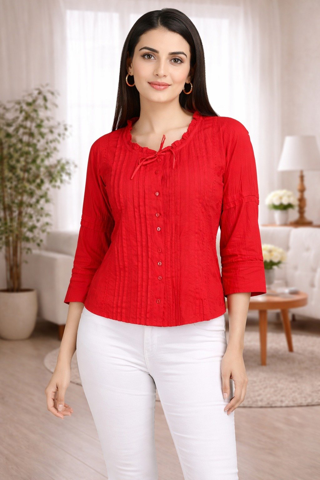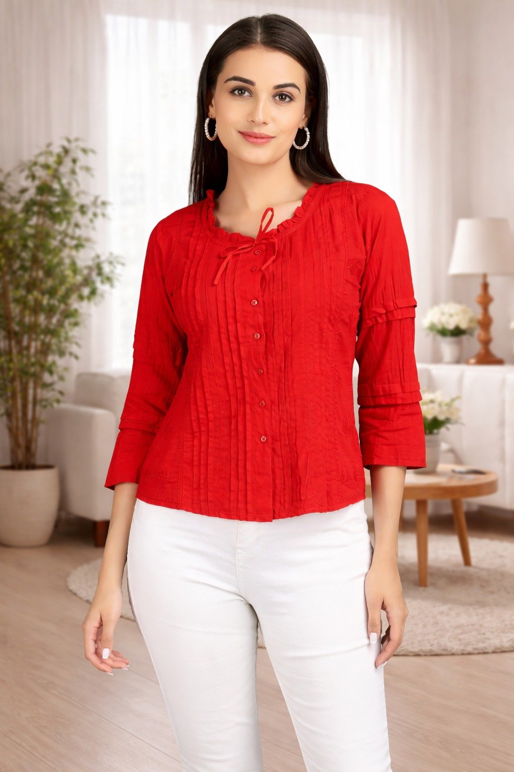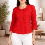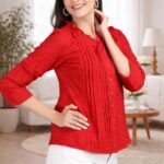 Enhance your wardrobe with this classy red pintuck top designed for modern women. Made from soft and breathable fabric, this top offers both comfort and elegance.