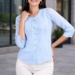 Add a fresh and classy vibe to your wardrobe with this elegant sky blue top. Designed with soft breathable fabric, this top ensures comfort along with a polished look.